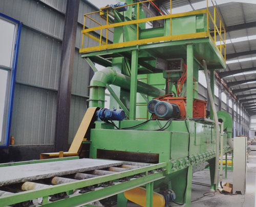 在此基礎(chǔ)上制作出的設(shè)備叫做“拋丸機,其主要組成部門有:拋射器,上下料傳送帶,鋼丸輪回系統(tǒng),自動控制系統(tǒng)和環(huán)保系統(tǒng)等。拋丸機的基本原理是:經(jīng)由人工或自動化設(shè)備將石料放至于傳送帶上,傳送帶將石料送入拋丸室,離心式拋射器將淤滯的鋼丸拋射到石料表面,經(jīng)處理后的石料通過輸送帶移到下料區(qū)。鋼丸則通過回收,分選等程序得以重復(fù)使用。